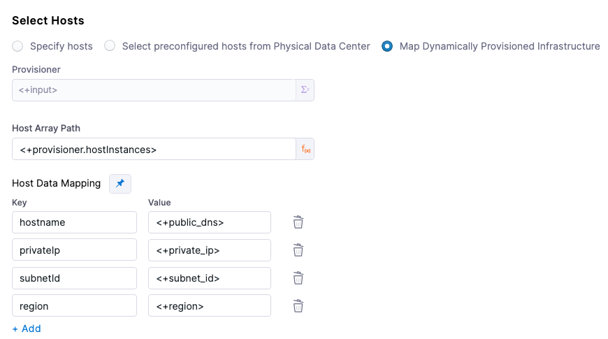 For the subsequent Host Data Mapping key-value pairs, you use the expression format <HOST_PROPERTY>. For example, <+public_dns> or <+privateIp> which are part of terraform output configuration in below snippet example.