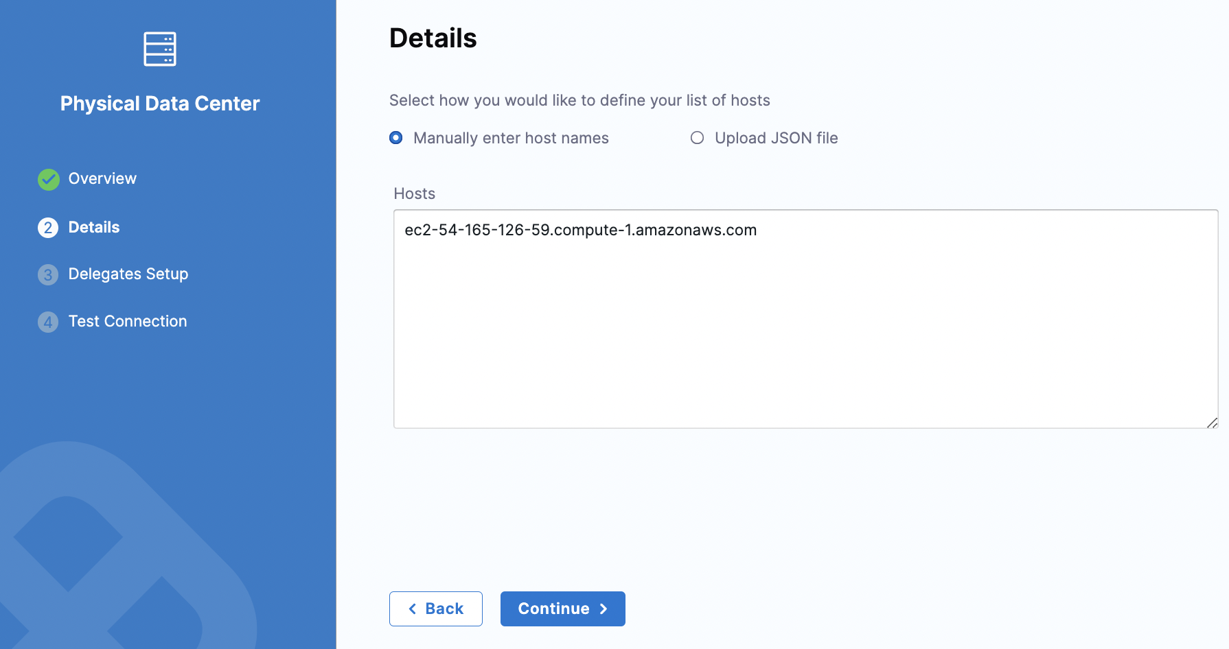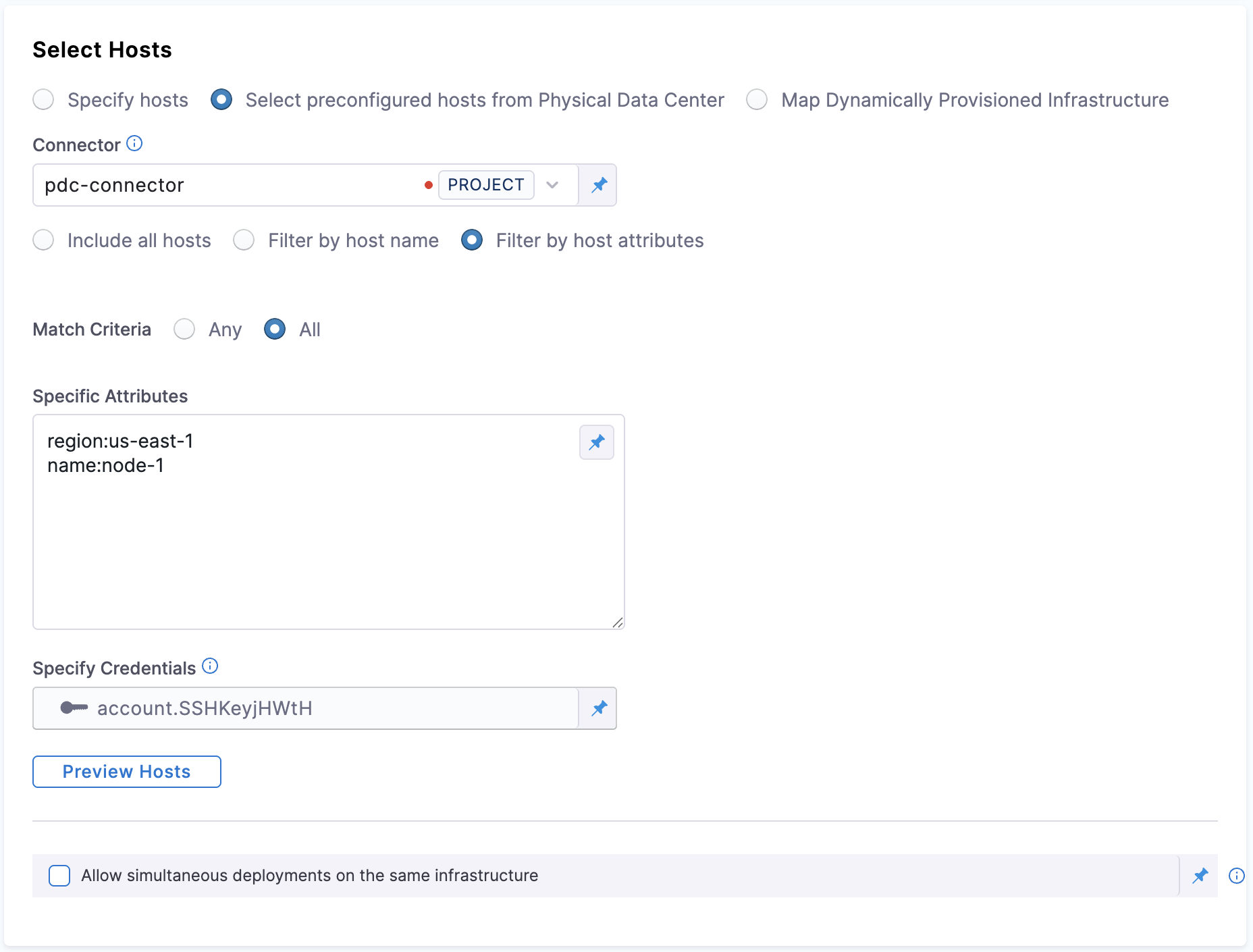 - Select preconfigured hosts from Physical Data Center: Use a PDC connector to pull registered hosts, with optional filtering by host name or host attributes.