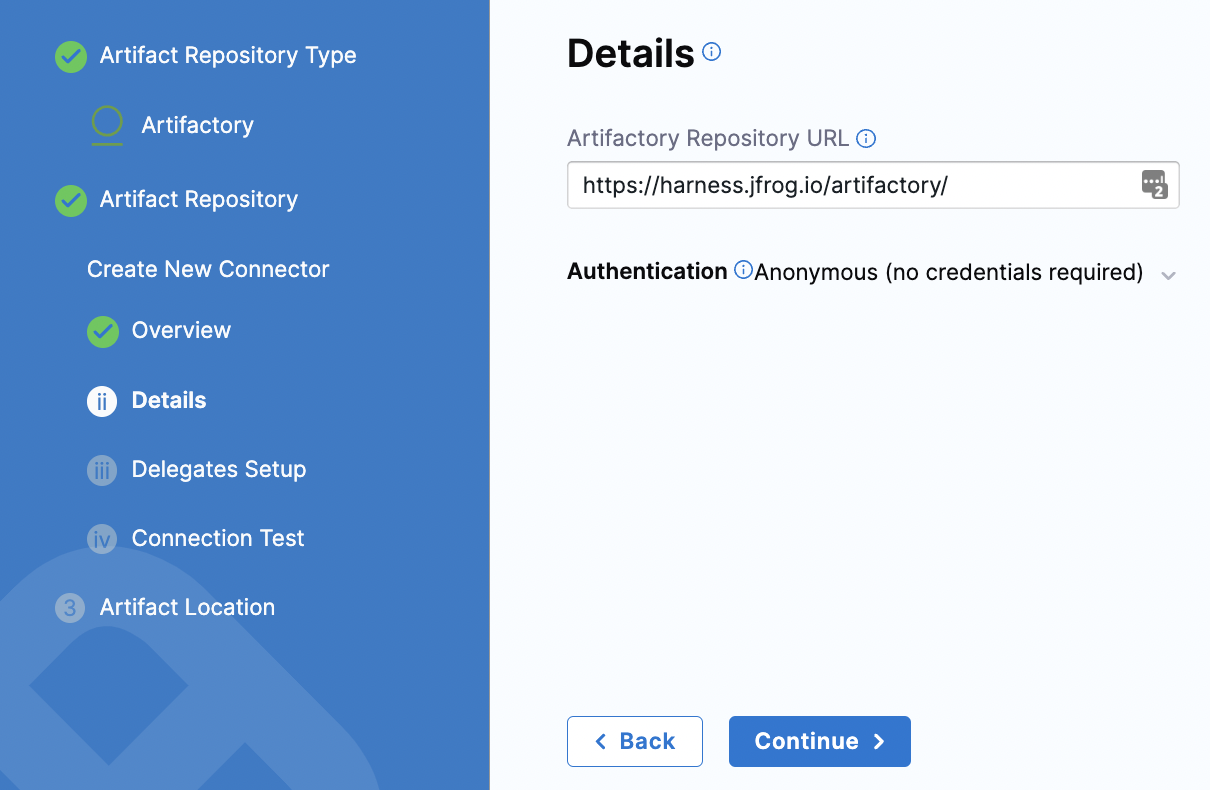 https://harness.jfrog.io/artifactory. In this tutorial, we will use the artifacts stored in that repository. - For Authentication, click the down-drop arrow for Username and Password. Then, select Anonymous (no credentials required). Click Continue.