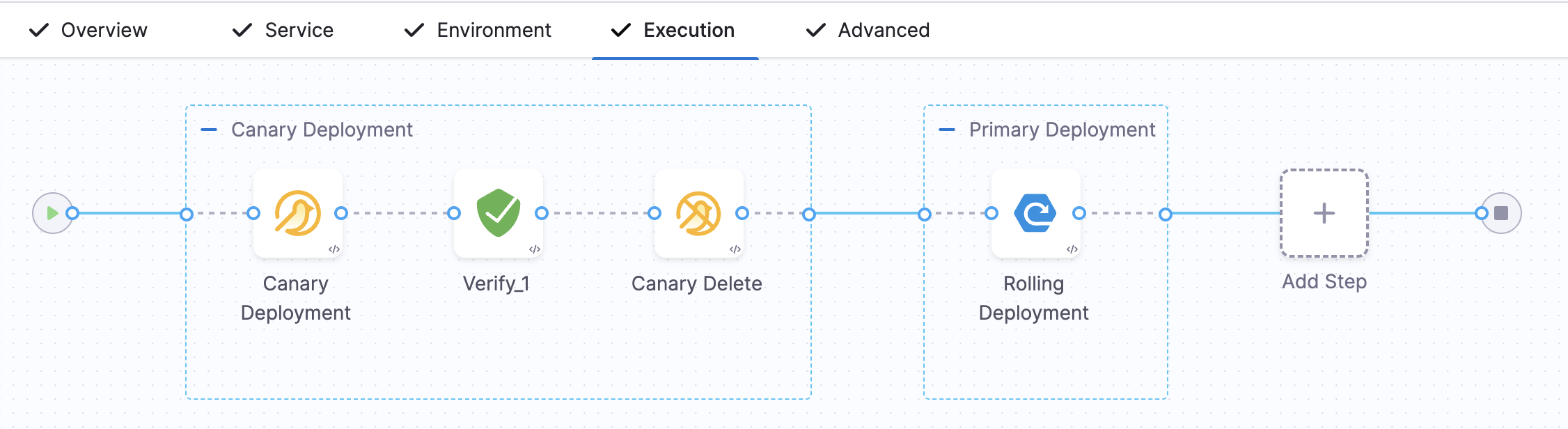 • Harness will automatically add the Verify step. For example, here is a stage where Canary strategy and the Enable Verification option were selected