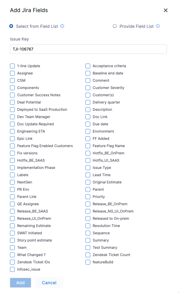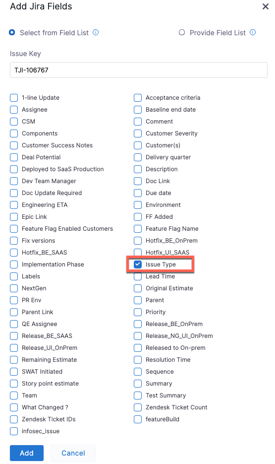 In the Add Jira Fields dialog, select Issue Type, then select Add. The Issue Type field appears under Optional Configuration.