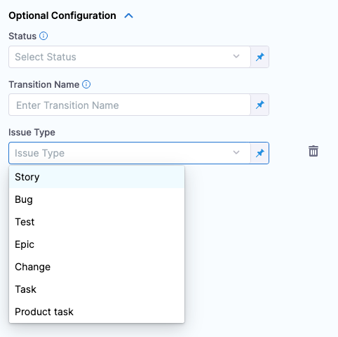 - In Status, enter the status type (Issue Action) to update the issue with (In Progress, Done, etc). Harness will automatically update the issue with this status.