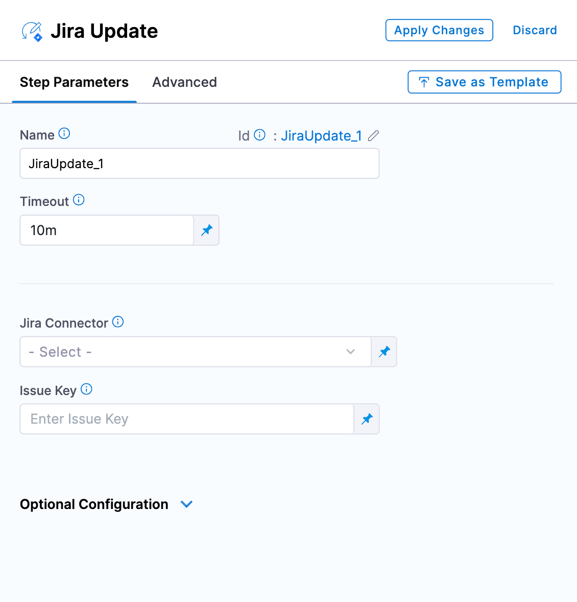 In the Jira Create or Update step, select Optional Configuration.