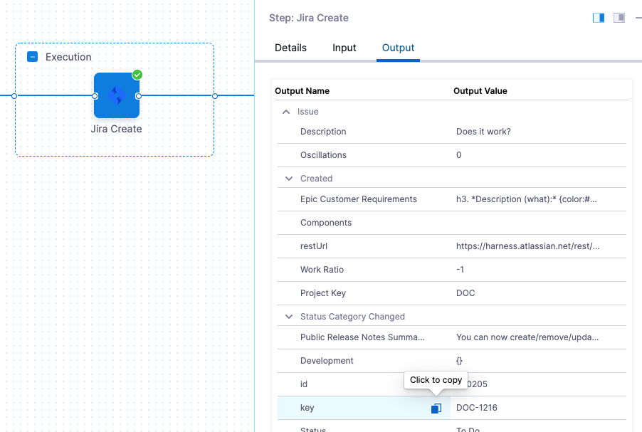 In the pipeline execution view, select the Jira Update step, and then select the Output tab.