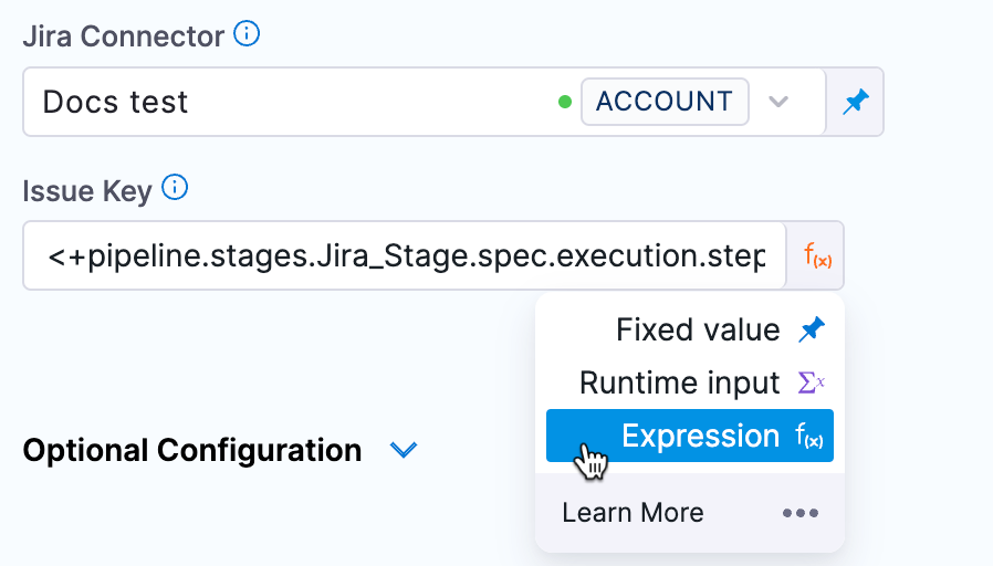 - Harness uses the Jira Project and Issue Type you select in Add Jira Fields to fetch the list of fields. If you use a runtime input or expression for Issue Key and the Jira Project and Issue Type you selected does not correspond with the issue key resolved at runtime, your pipeline could fail to execute successfully.