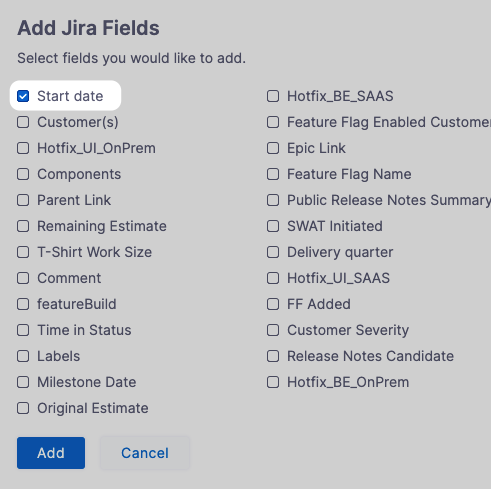Among the custom fields Harness supports are Baseline End Date and Start Date Time. If your Jira project uses these fields, they are available in Fields: