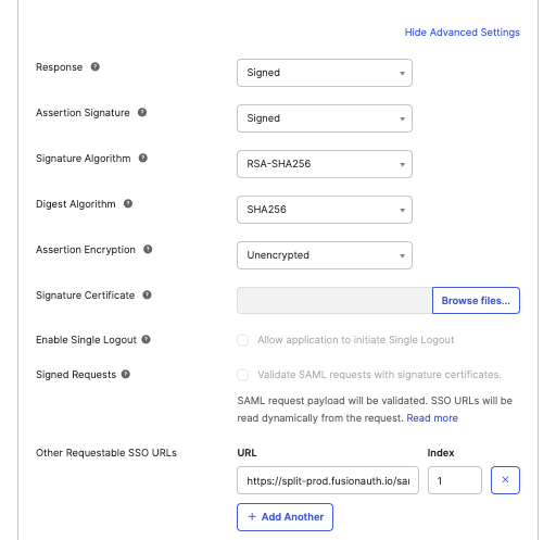 9. Click Add Another under Other Requestable SSO URLs and set the URL to the Requestable SSO URL provided in Split in the configuration parameters. Set the Index value to 1.