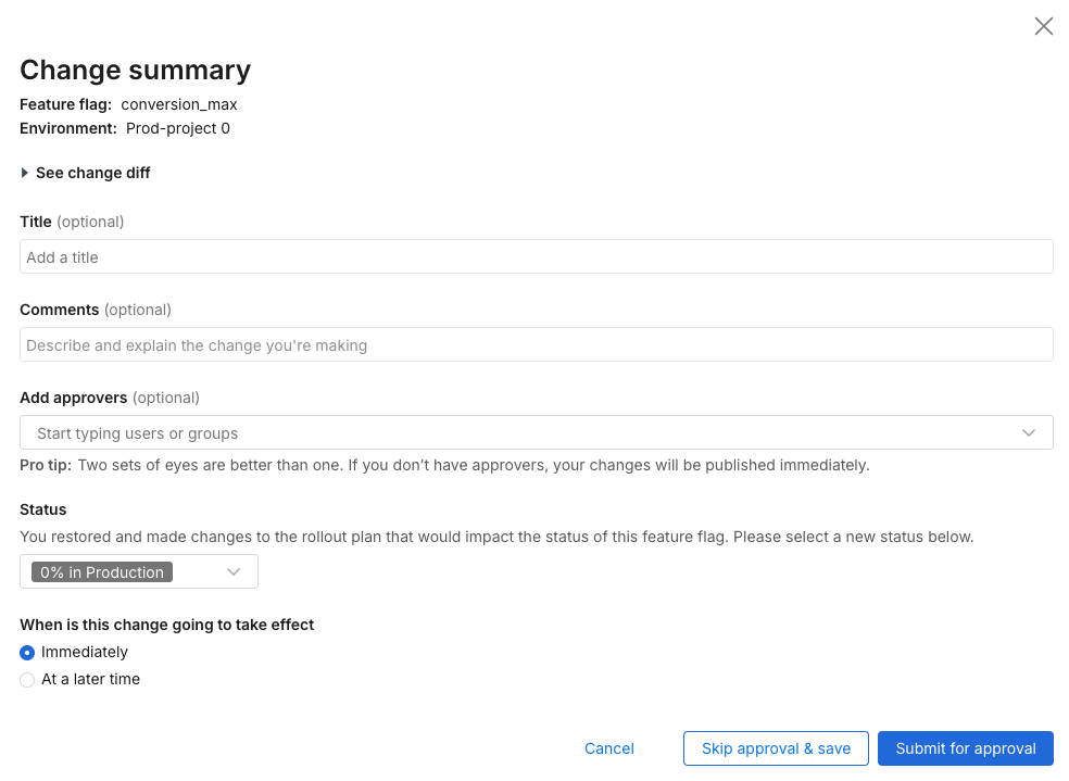 Additionally, you can also change permissions when you click the Review changes button on the Targeting rules page. This takes you to the Change summary page with the option to either click the Skip Approvals & Save link or go through the approval process similar to other users.
