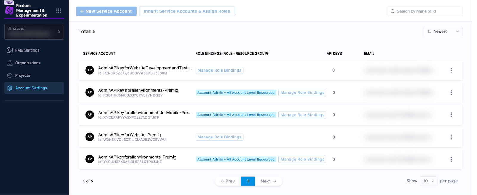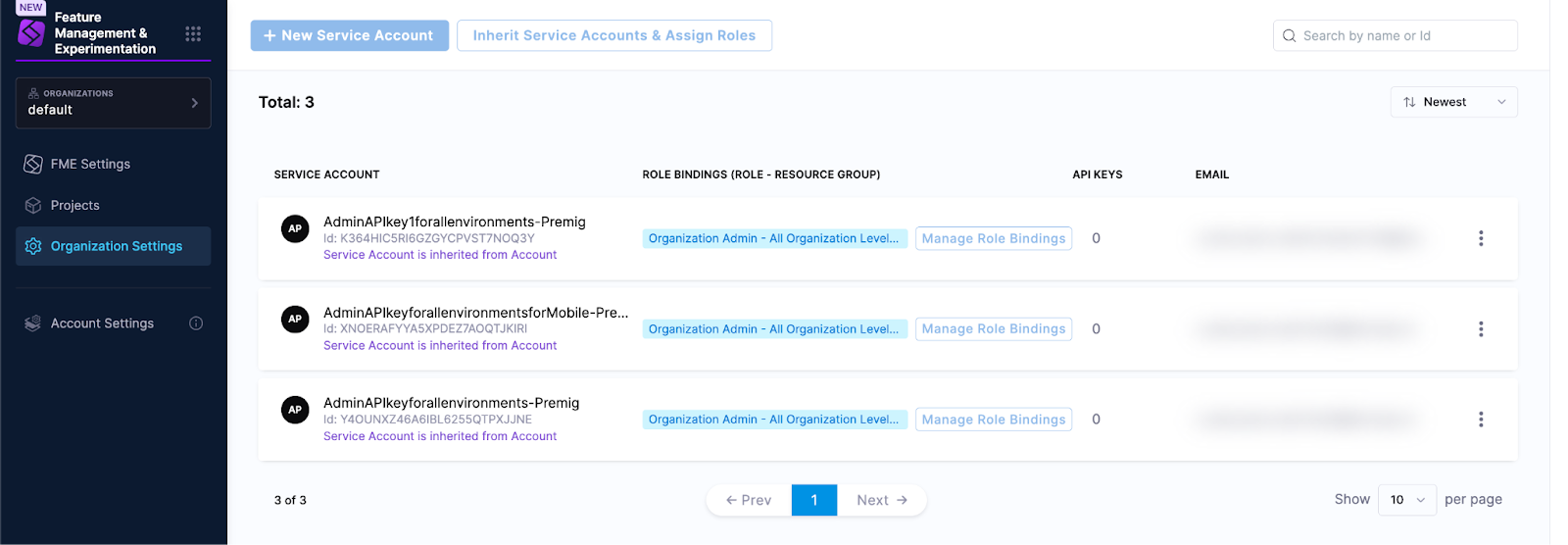 5. Under the Account or Organization tab*, click on the Harness service account corresponding to the legacy Split Admin API key (the name will match the name of the legacy key, shown in FME Settings, but without spaces).