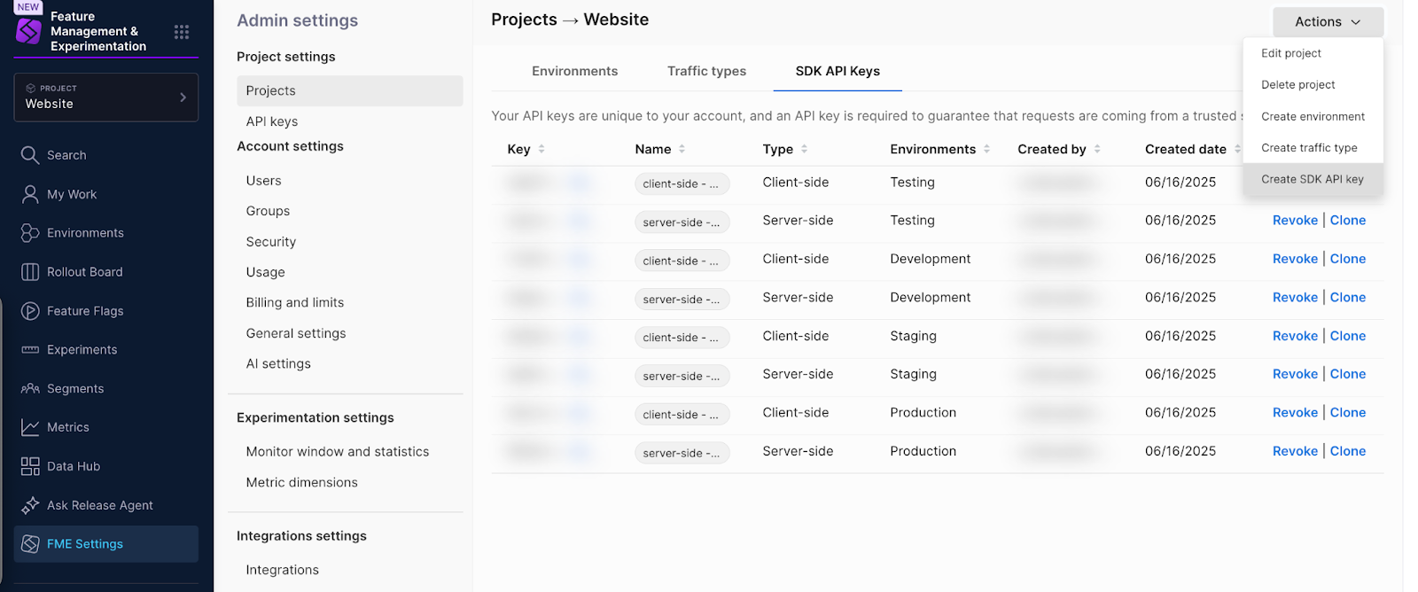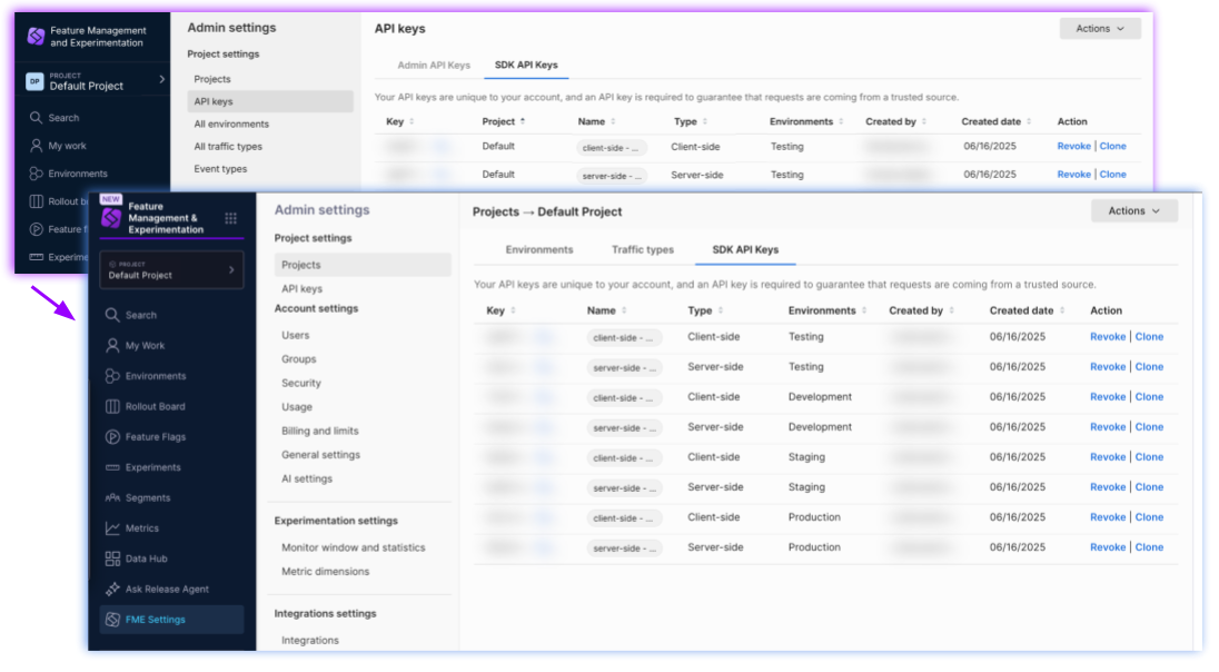 • SDK API keys: Authentication tokens used to authorize FME SDK requests. SDK API keys are managed by the Harness FME module.