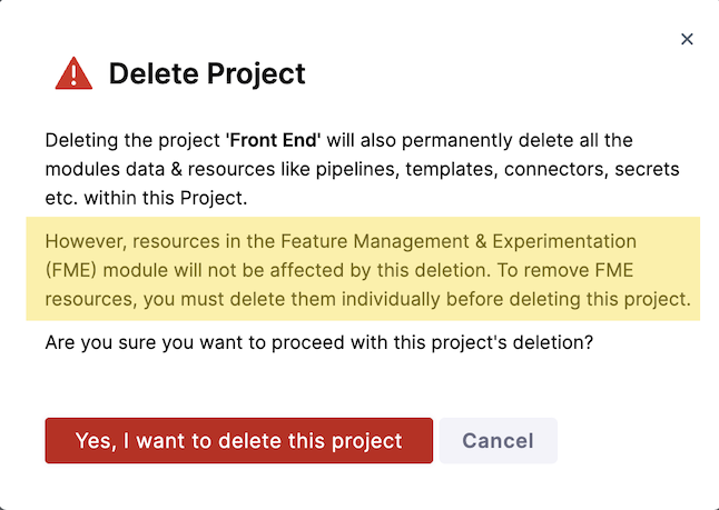 If your Harness admin does not see your FME project on the Projects page in FME Settings, then the project may have been deleted in Harness without first deleting all FME project resources. You can take the steps in the next section (below).