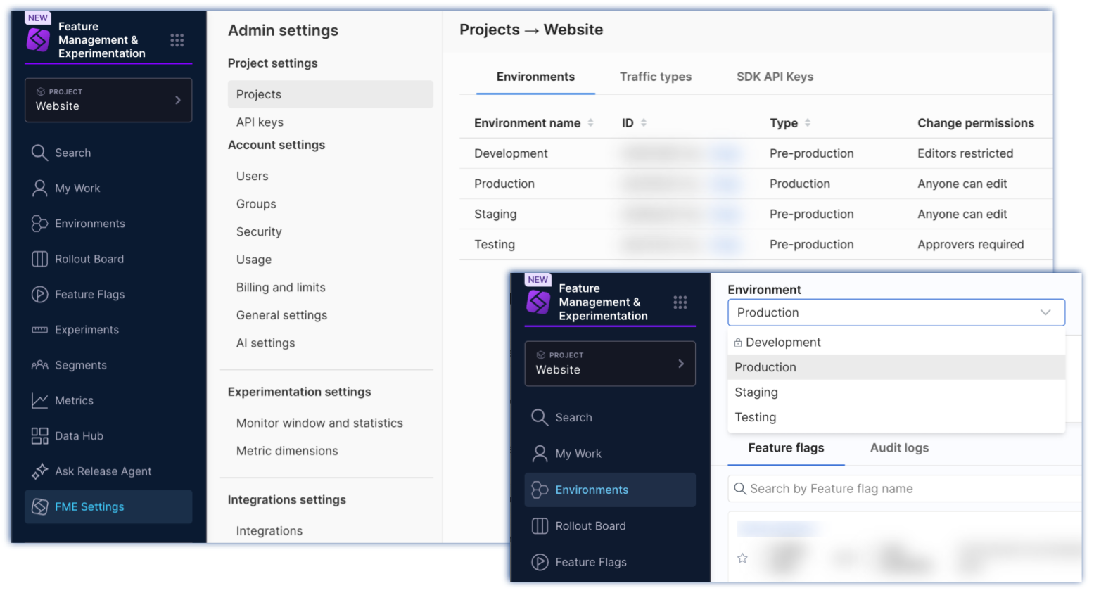 • SDK API keys - Outlines how SDK API keys (that authorize feature flag evaluations in your code) are managed in FME Settings.
