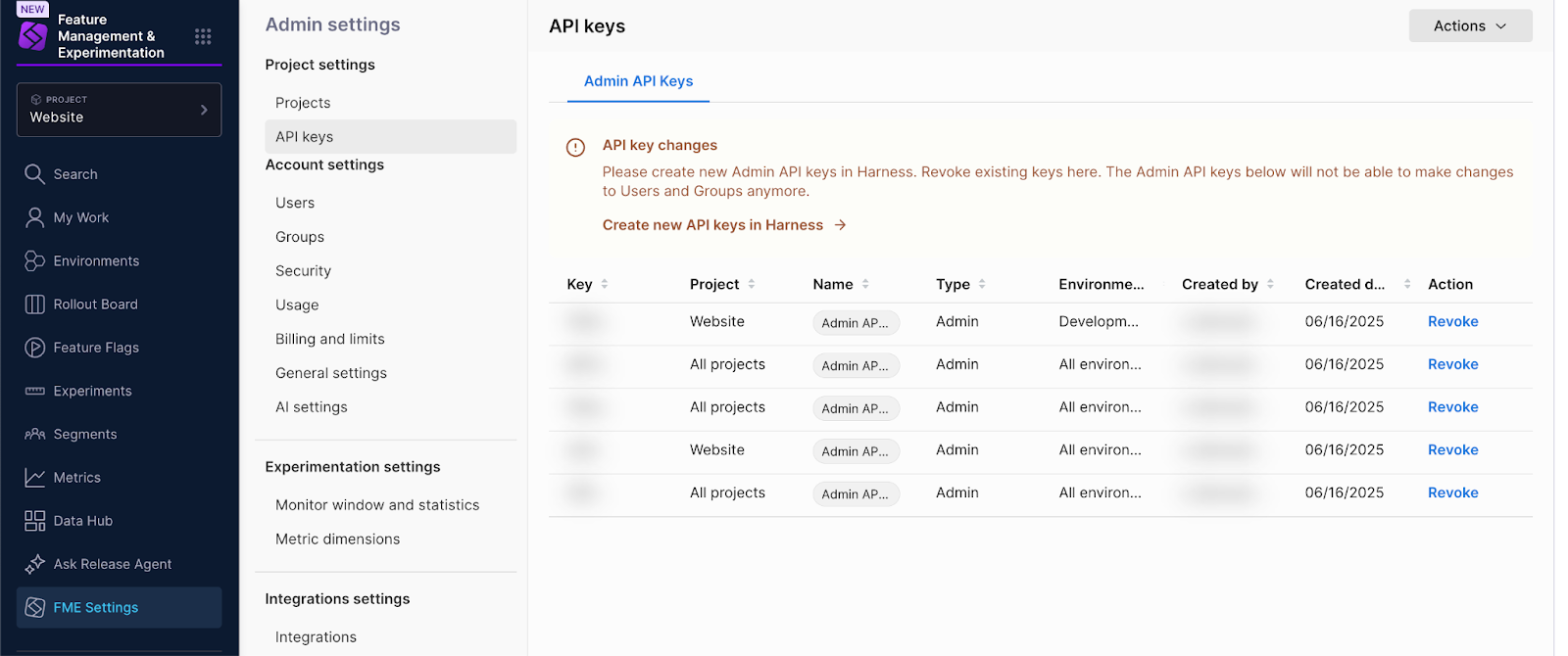 Legacy Split Admin API keys scoped to specific environments (created before migration) continue to work but are no longer recommended. See Harness RBAC in FME to configure permissions for FME resources and FME Permissions Enforcement to learn how RBAC rules are enforced in Harness FME.