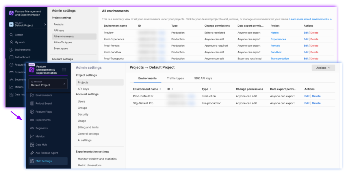 In the Feature Management & Experimentation module in Harness, FME environments are created for your project. FME environments are used to scope your FME SDK API keys, FME feature flag definitions, FME segments, and FME experiments. Within the FME module, you can access a project's FME environments from the left navigation pane, by clicking Environments or by clicking FME Settings (and then clicking the View link for a project).