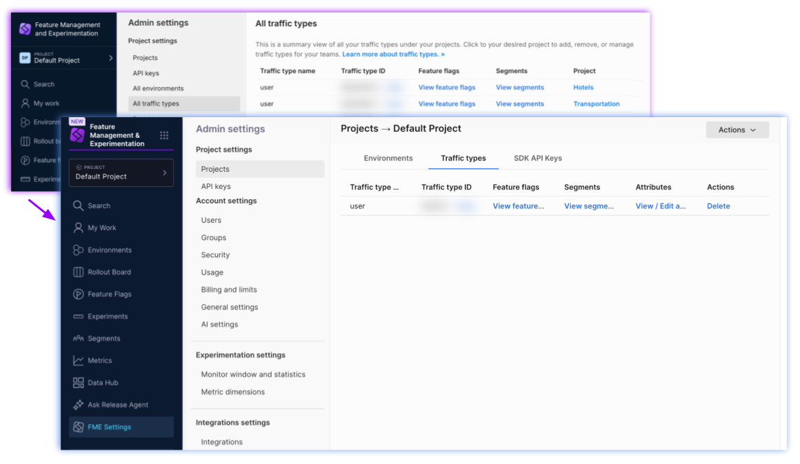 • Harness FME: This refers to the legacy Split application once it has been migrated to app.harness.io. The migration preserves the application intact and converts it to a module within Harness called Feature Management and Experimentation (FME).