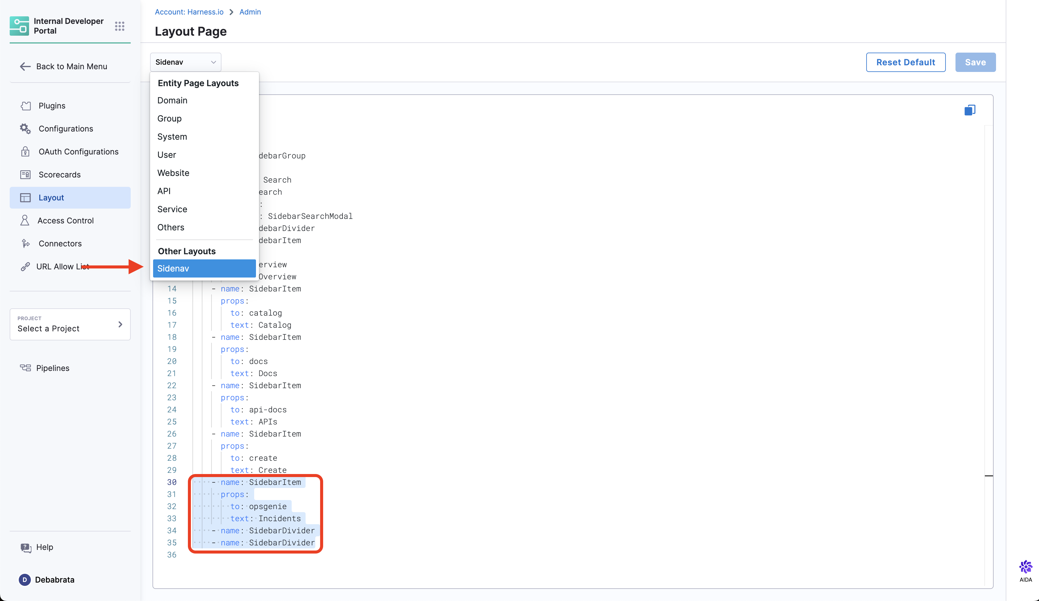The following configuration needs to set by users in Layout under Admin for Sidenav to get the opsgenie page.
