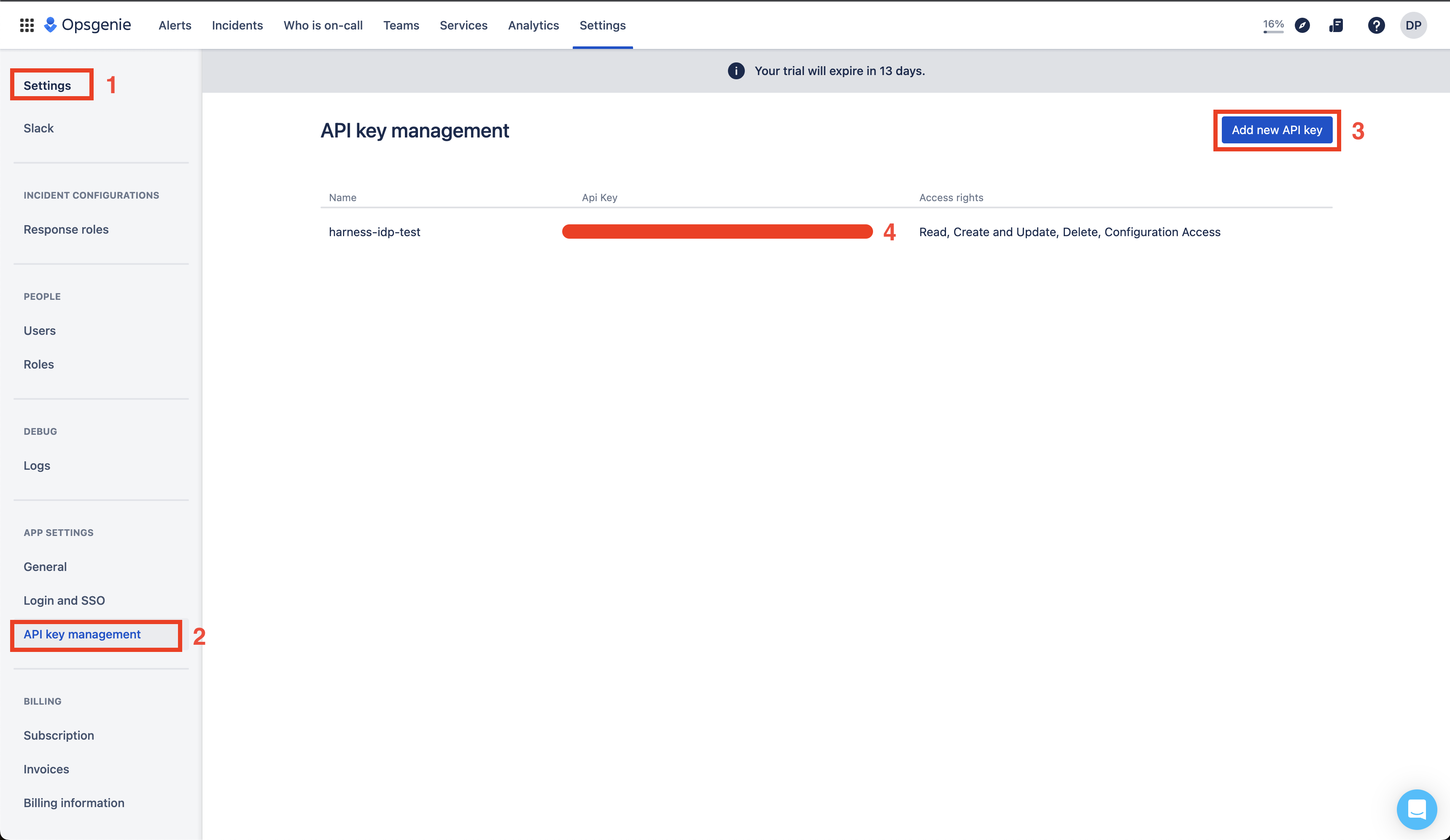• In your Opsgenie application Go to Settings under App Settings select API key management and Add new API key.