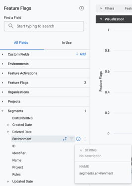 If you have trouble with a particular data point, pass both the table name and the field name in the prompt. For example, if you want to view your feature flags by segment environment, you could enter the following prompt: What are my total feature flags? Pivot by segments environment.