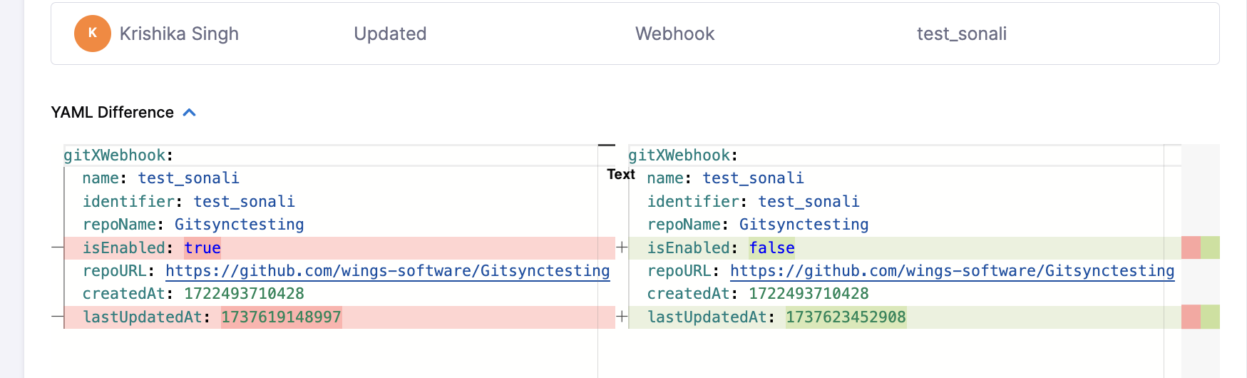 • View Webhook Events: in the Git information on your Harness entity, you can select View Webhook Events and see each event and payload for that entity.