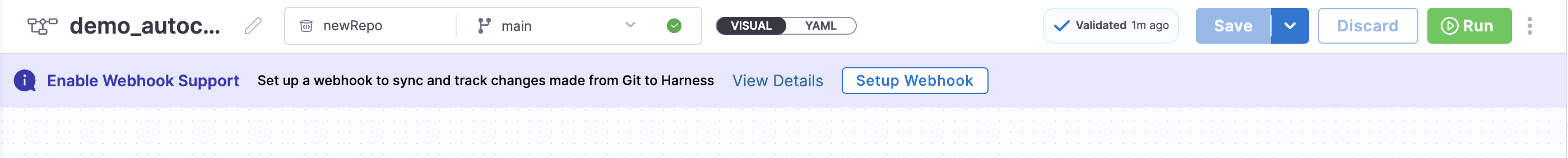 When an entity is not set up for bidirectional sync (that is, no webhook is registered for the corresponding Git repo or file path), Harness displays a banner to simplify webhook registration.