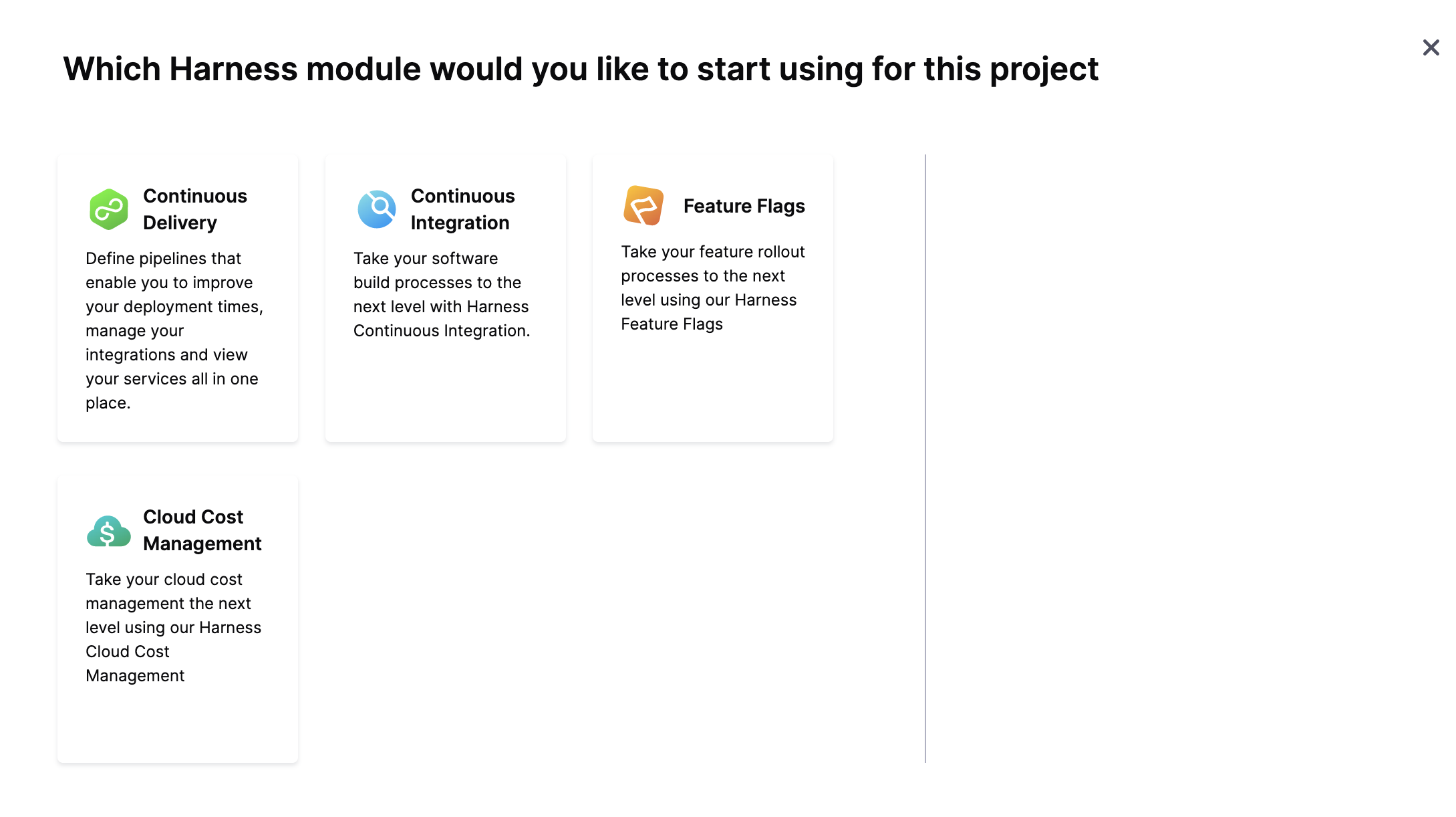 Your project can add Harness products as modules, such as Continuous Integration or Continuous Delivery.