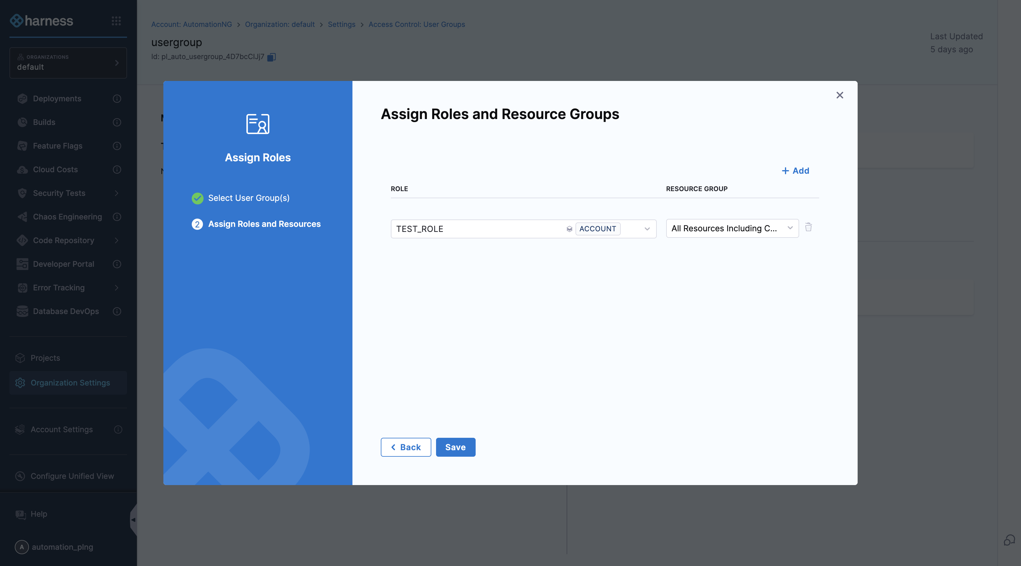 - In Harness, go to Account Settings, select Organizations, select the relevant organization, and then select Access Control.