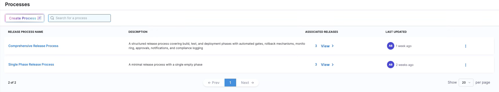 A process is a reusable blueprint that defines the structure of a release. It consists of phases, activities, dependencies, inputs, and variables. Processes can be created manually or using AI-based process creation.