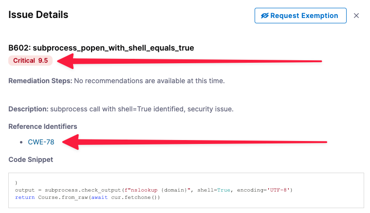 Many of the details you see for each issue are derived from the external scanner. These details can differ, depending on the scan tool you're using. In this tutorial we're using Bandit, which is a free, open-source scan tool. In general, paid scanners provide more extensive details (such as remediation steps) than free ones.