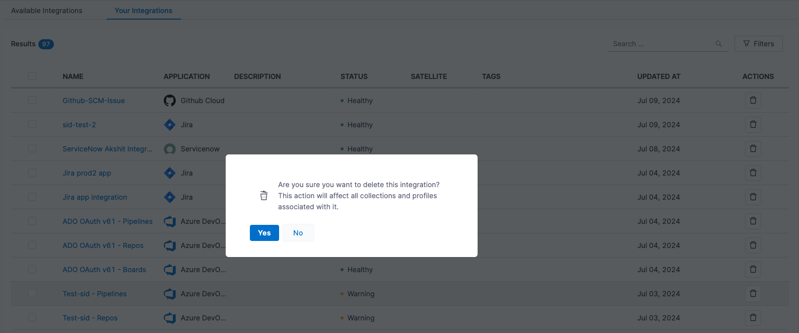 The integration status will change to Deleting. The deletion process is scheduled, and once complete, the integration will no longer be listed in the Available Integrations tab.