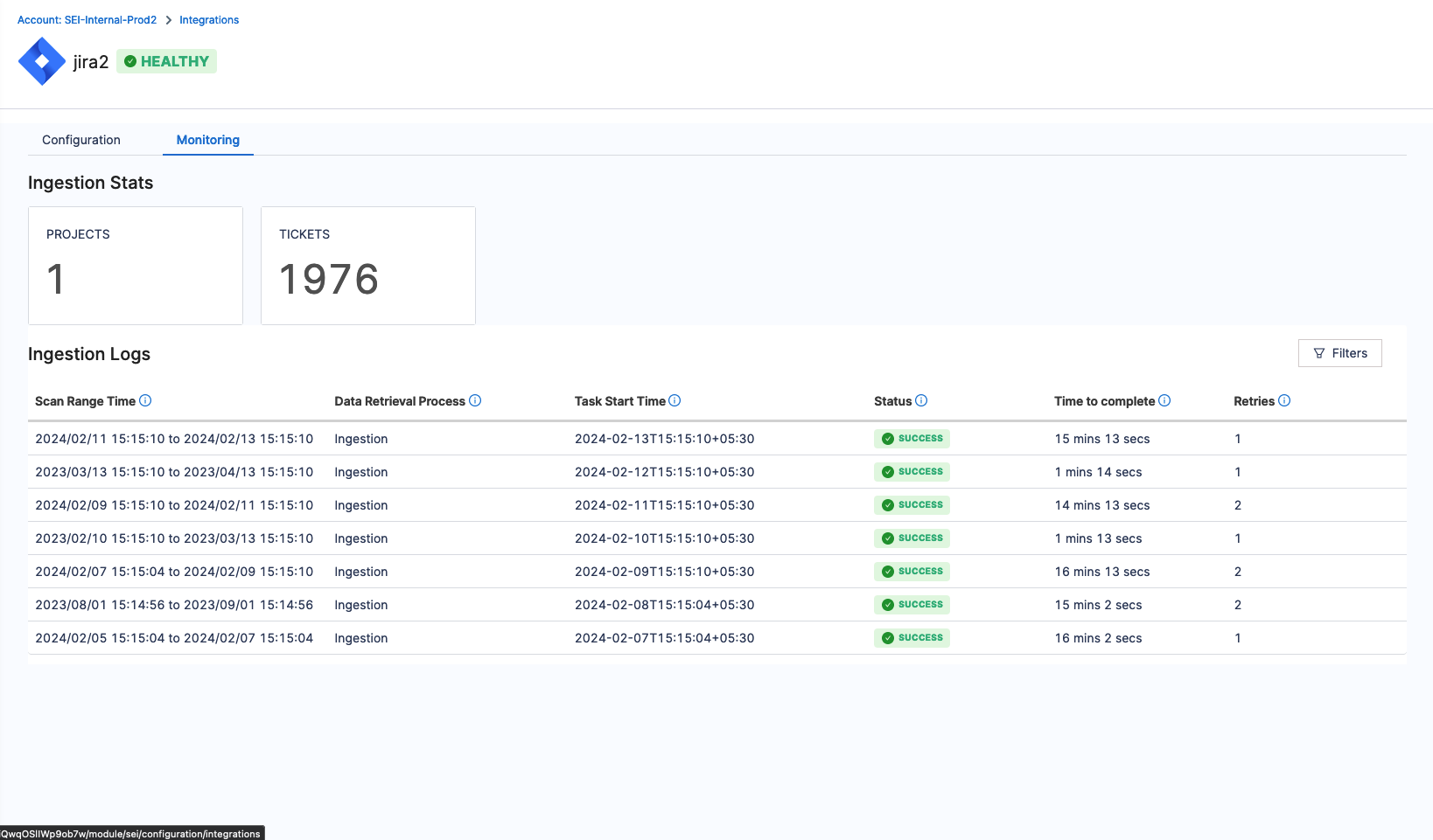 Configuring integrations allows SEI 2.0 to pull data from a variety of development tools.