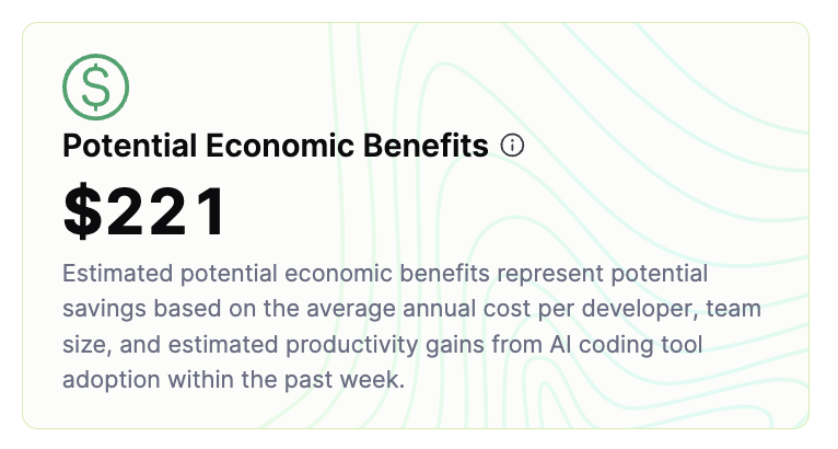 The Potential Economic Benefit represents the potential dollar amount saved by increasing developer productivity through AI tool adoption. It helps you estimate the economic benefits of rolling out AI code assistants across your entire organization based on productivity gains.