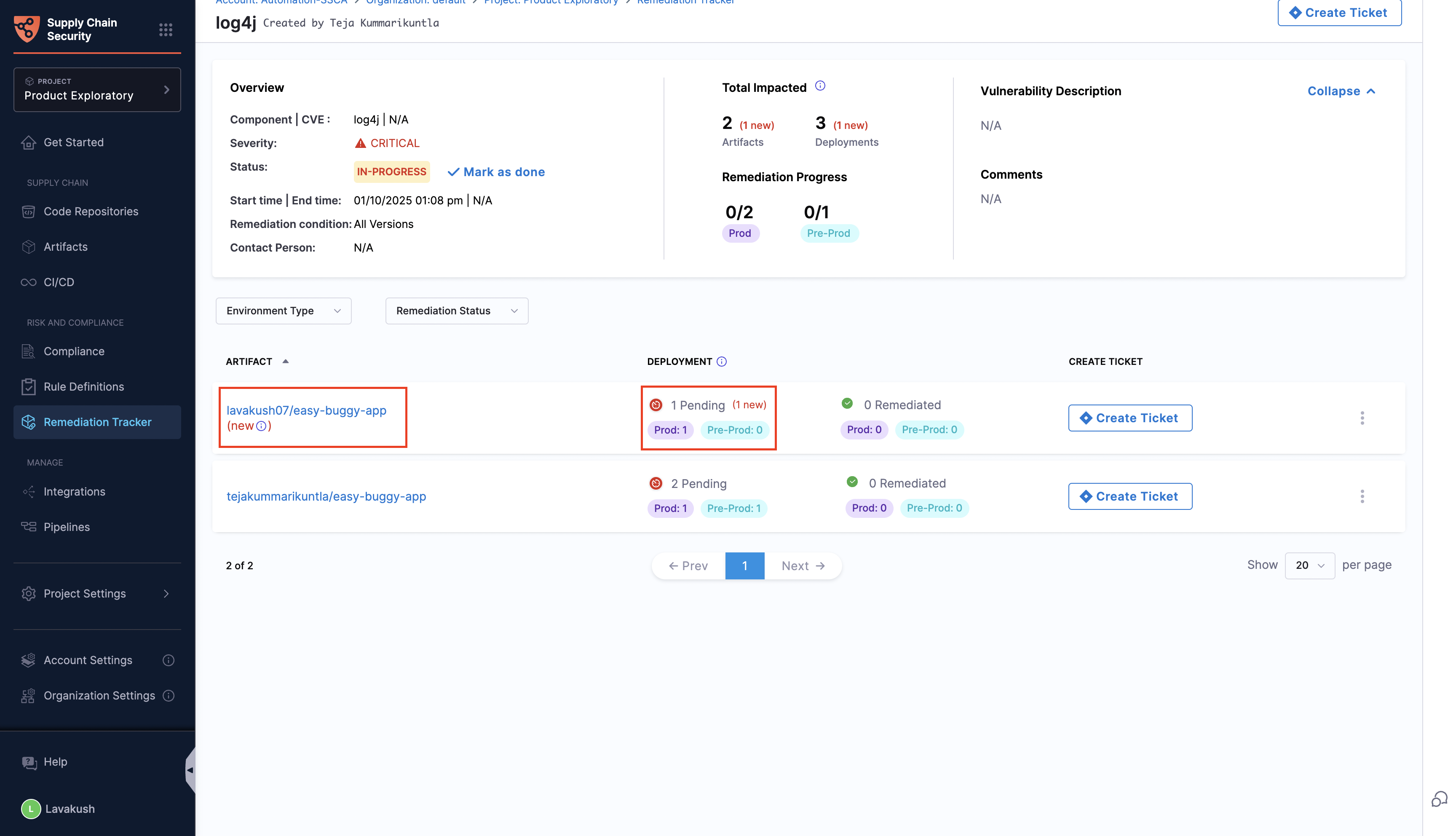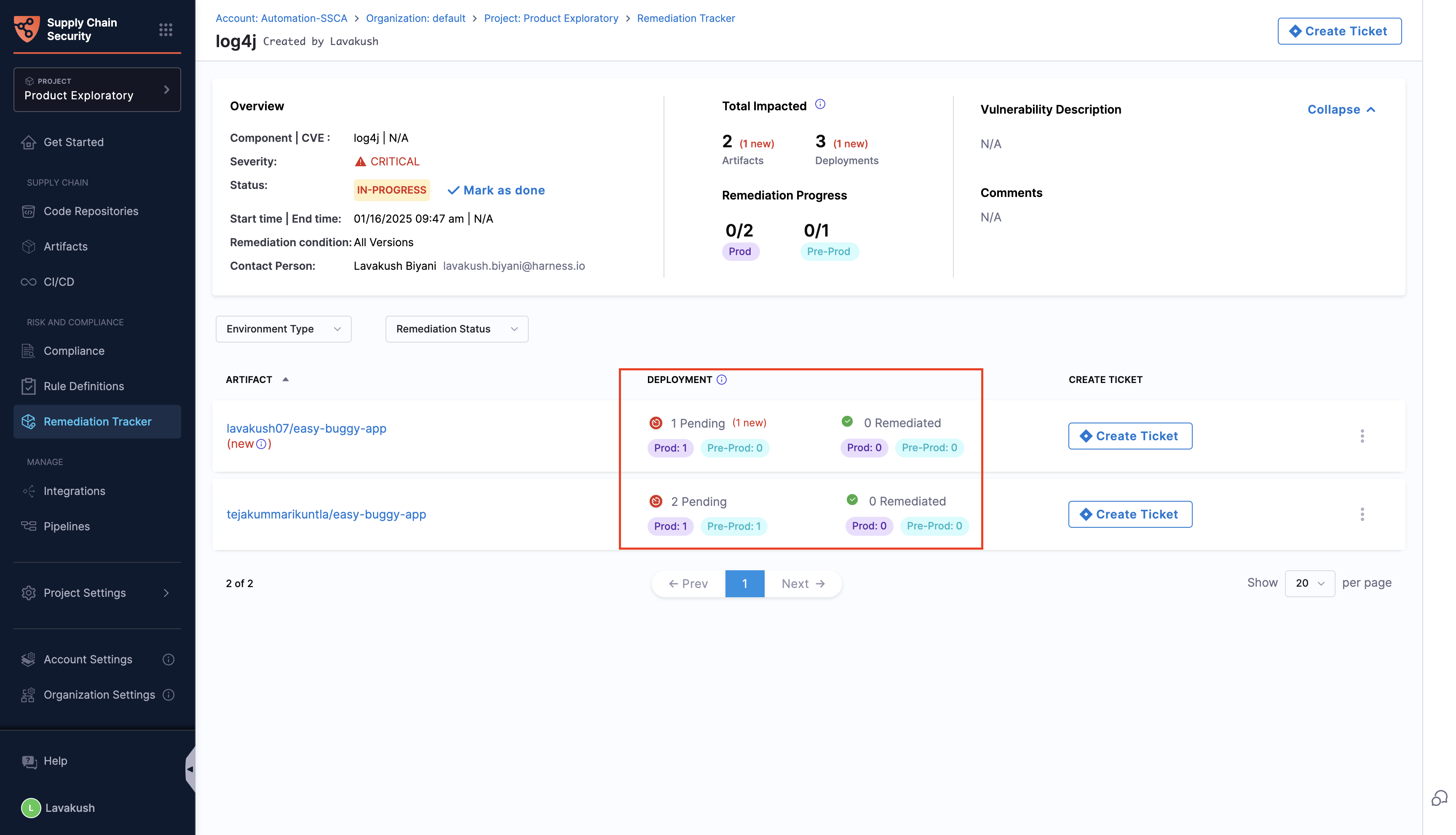 While you can view the status of each individual artifact, the Remediation Progress section within the tracker provides a comprehensive overview of the overall status. It includes the total number of impacted artifacts and environments. Importantly, it displays the active status of both production and pre-production environments that require patching, providing a clear picture of what is necessary for a complete and successful remediation.